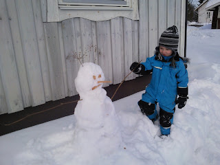Glad lillebror som, med hjälp av mamma, gjort världsbästa snögubben. "Kolla mamma! Den blev siiitsnygg!"